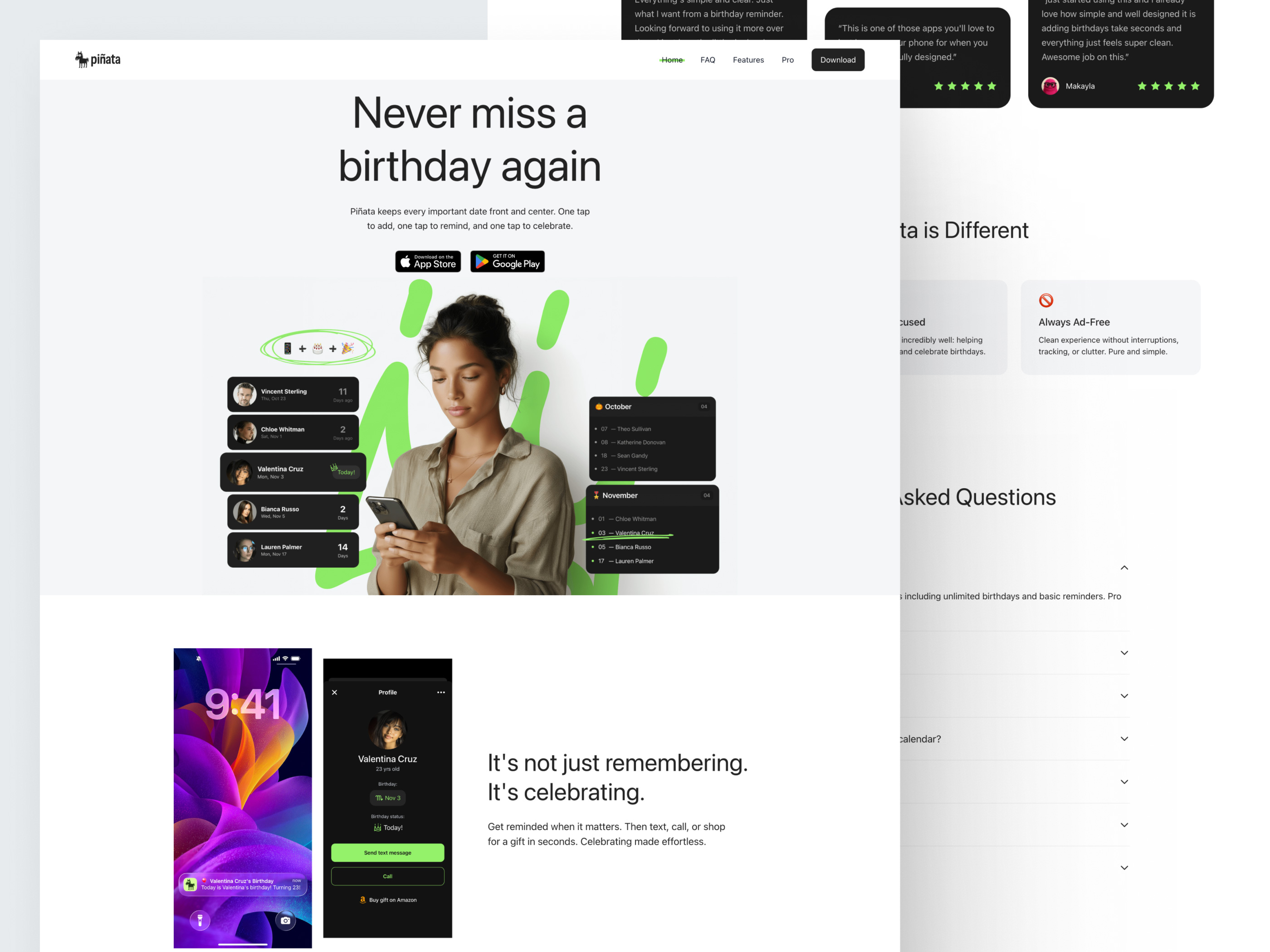 Piñata shipped on iOS and Android with a free tier and an optional Pro subscription. It is intentionally minimal, fast to set up, and designed to help people remember important dates and actually follow through.